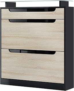 Vladon Meuble à Chaussures Fiesta, Corps en Noir Mat/Façades en Chêne Brut avec Un Decor en Noir Haute Brillance
