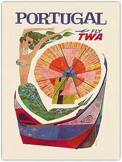Portugal Volez TWA - Compagnies Aériennes du Monde Trans - Moulin À Vent Sirène - Affiche Avion de David Klein c.1960s - Toile Organique Impression d'art 61x81cm